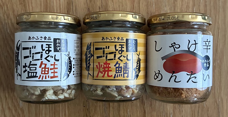 ゴロほぐし塩鮭、ゴロほぐし焼鯖、しゃけ辛めんたい。