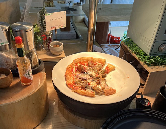 パスタの上に別の場所にあったピザやエビを乗せました。
